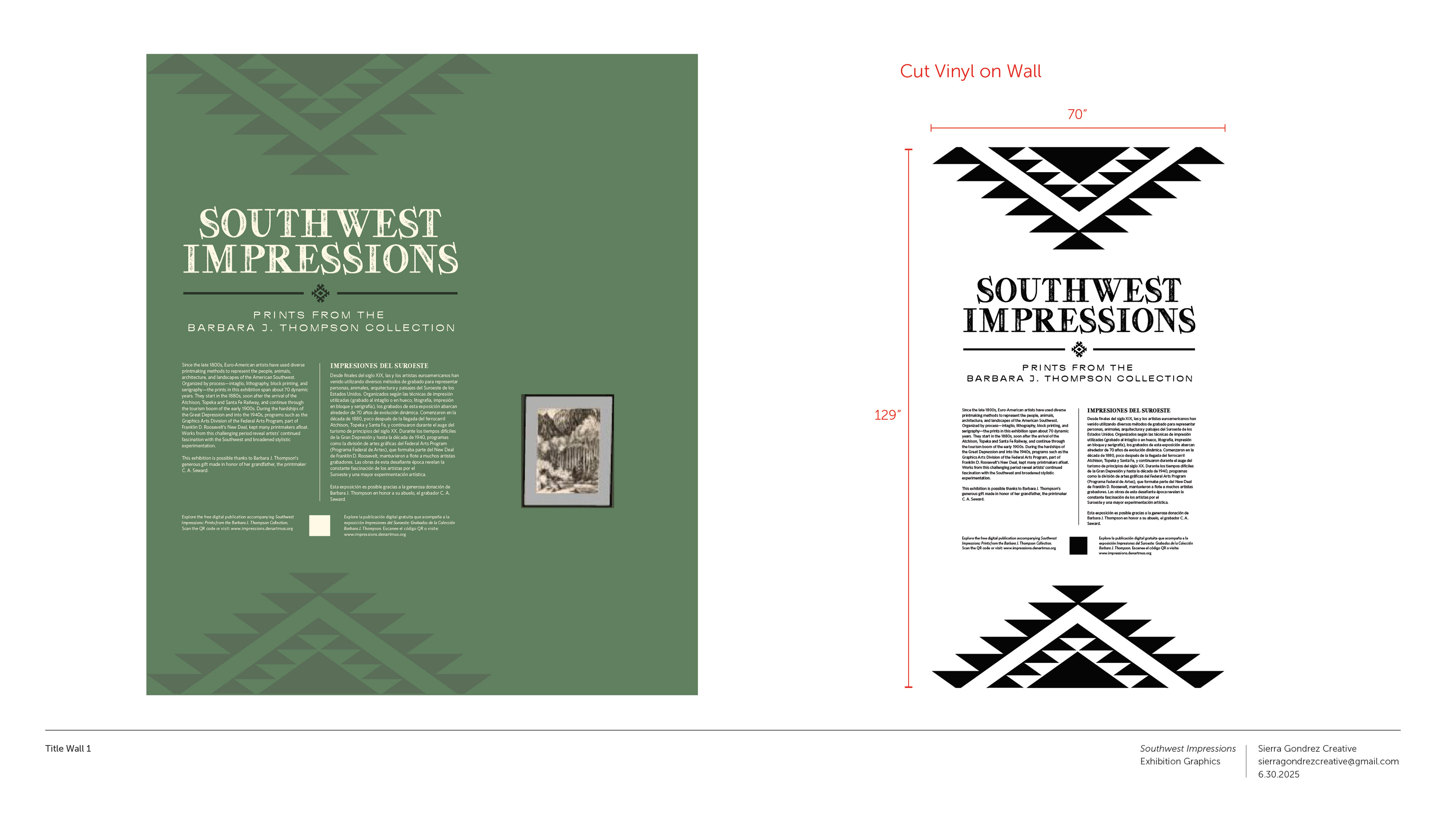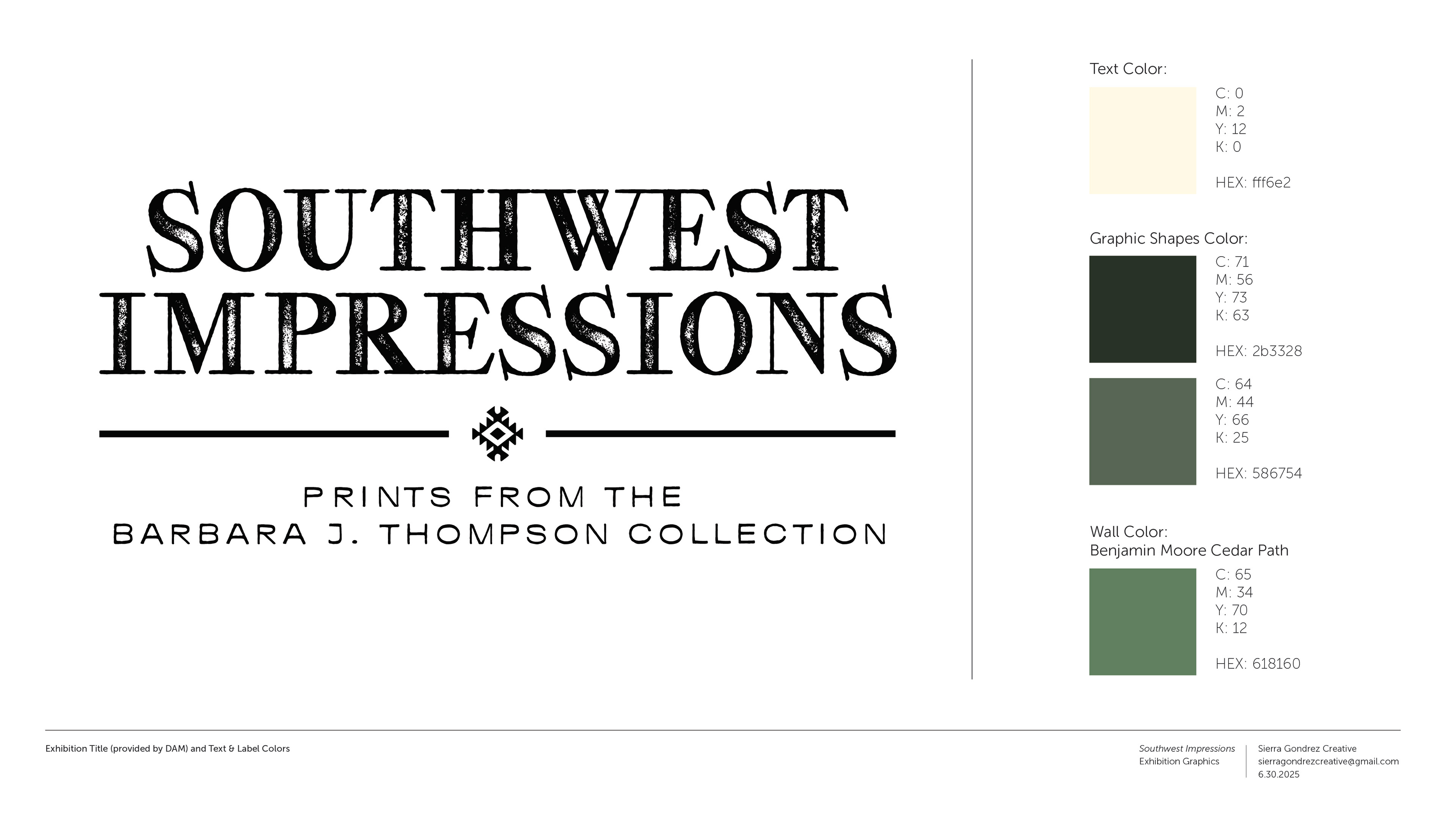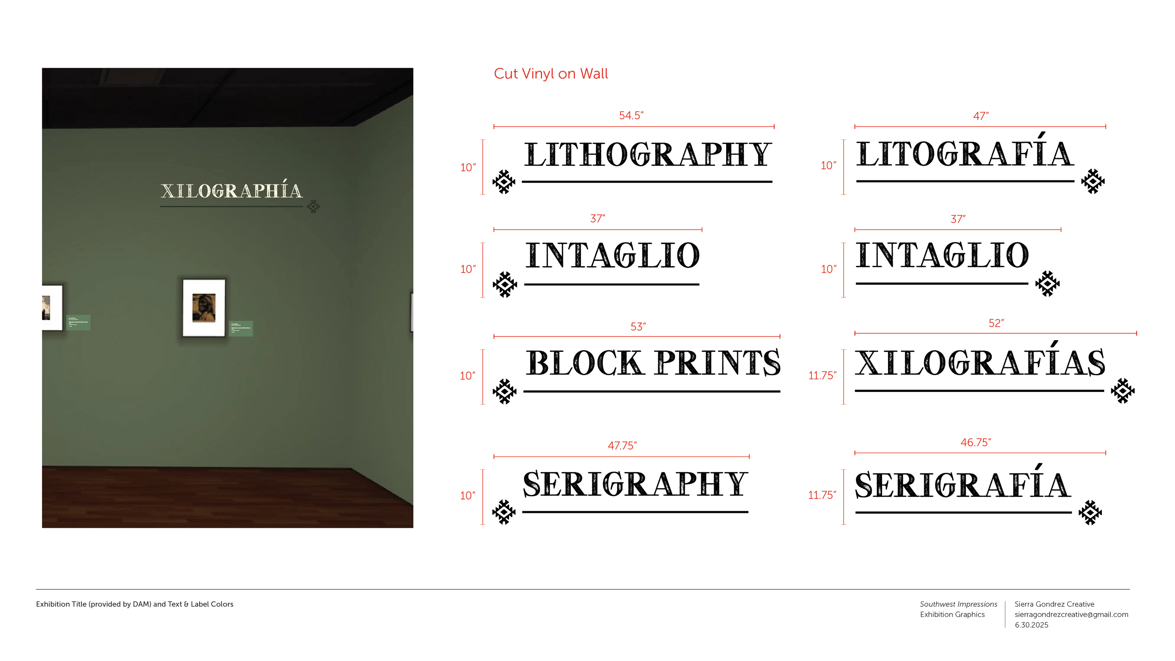 Design Notes: This exhibition showcased a variety of prints - lithography, intaglio, block printing, and serigraphy - made in and inspired by the Western United States. The exhibition logo was provided by DAM; I pulled inspiration for graphics from the logo as well as traditional patterns found in southwestern art. Super graphic text installed near the ceiling helped to denote different areas of the exhibit (each showcasing a different printmaking style) and served as a point of interest to capture visitor attention from across the gallery. Label design followed DAM's existing label guidelines.
