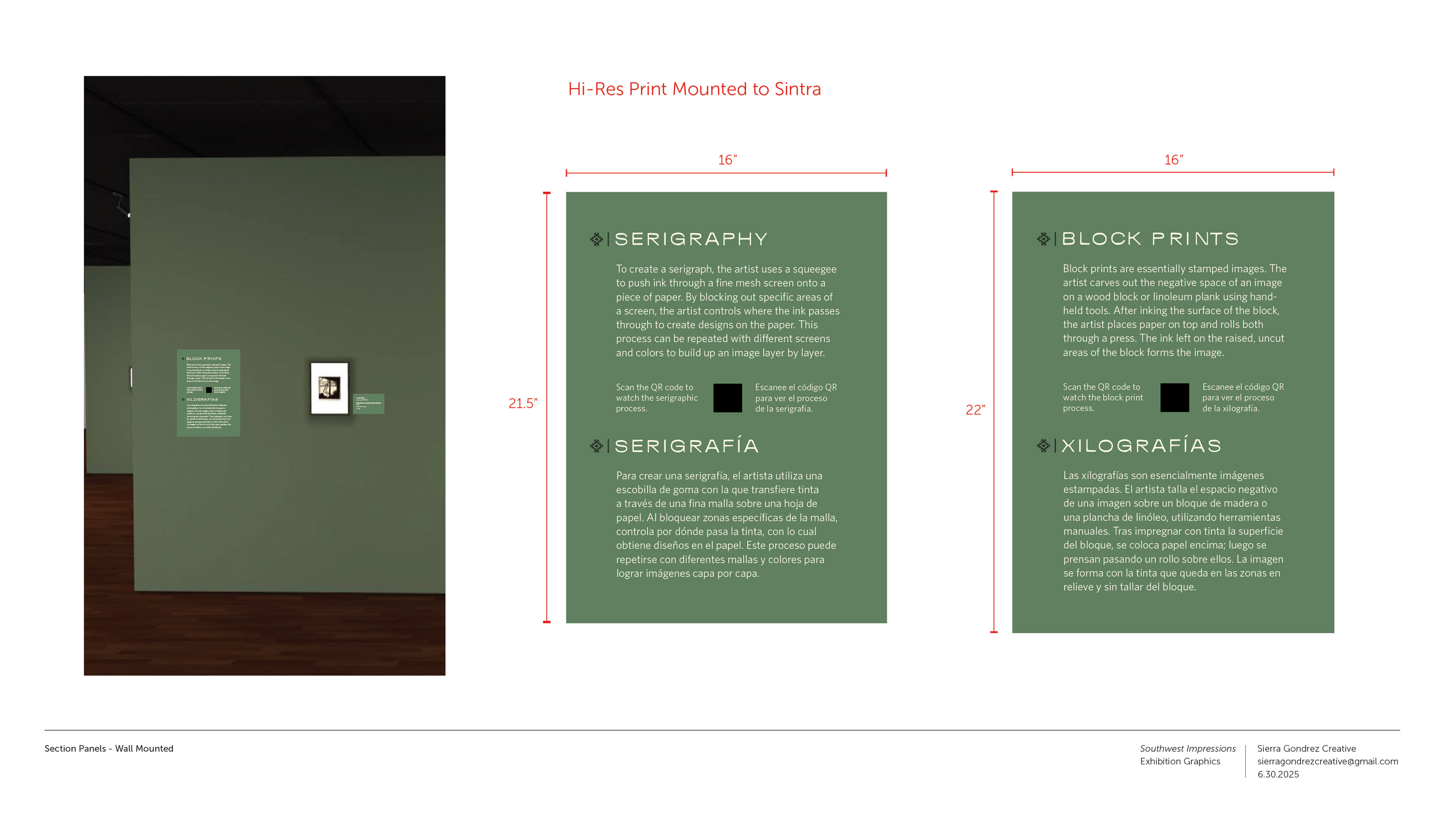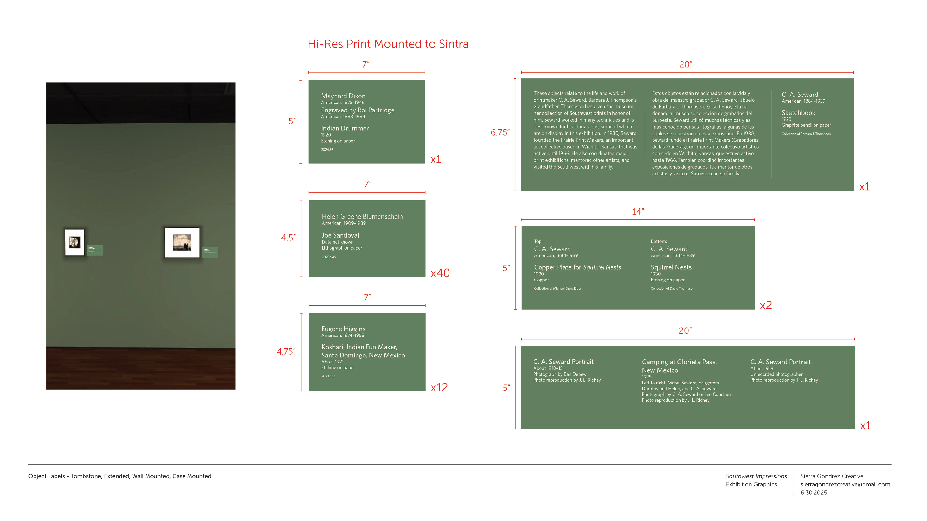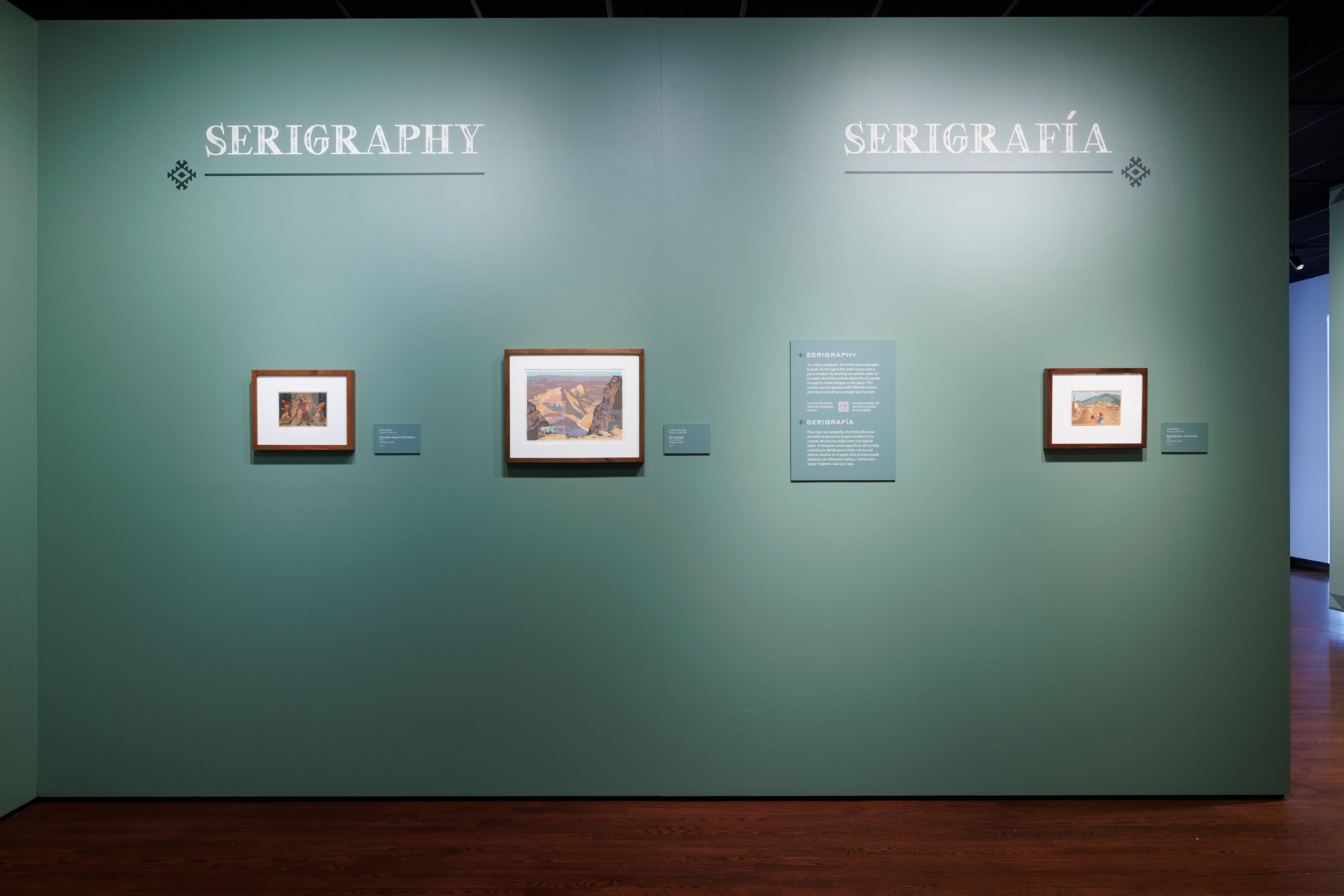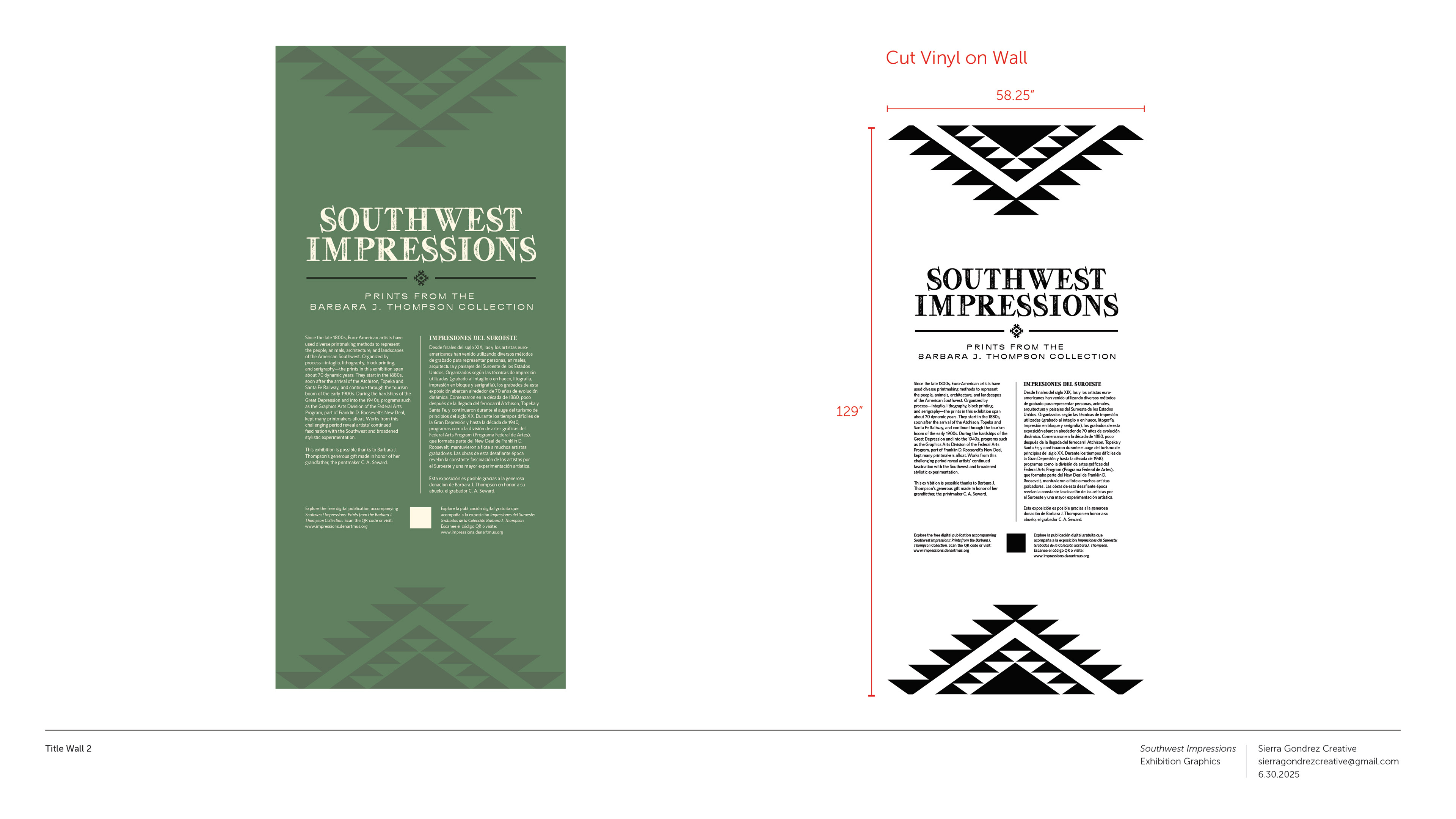 Design Notes: This exhibition showcased a variety of prints - lithography, intaglio, block printing, and serigraphy - made in and inspired by the Western United States. The exhibition logo was provided by DAM; I pulled inspiration for graphics from the logo as well as traditional patterns found in southwestern art. Super graphic text installed near the ceiling helped to denote different areas of the exhibit (each showcasing a different printmaking style) and served as a point of interest to capture visitor attention from across the gallery. Label design followed DAM's existing label guidelines.